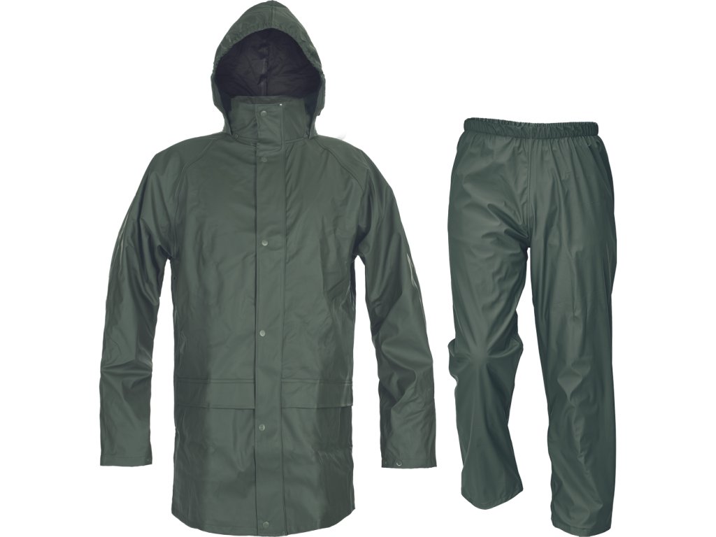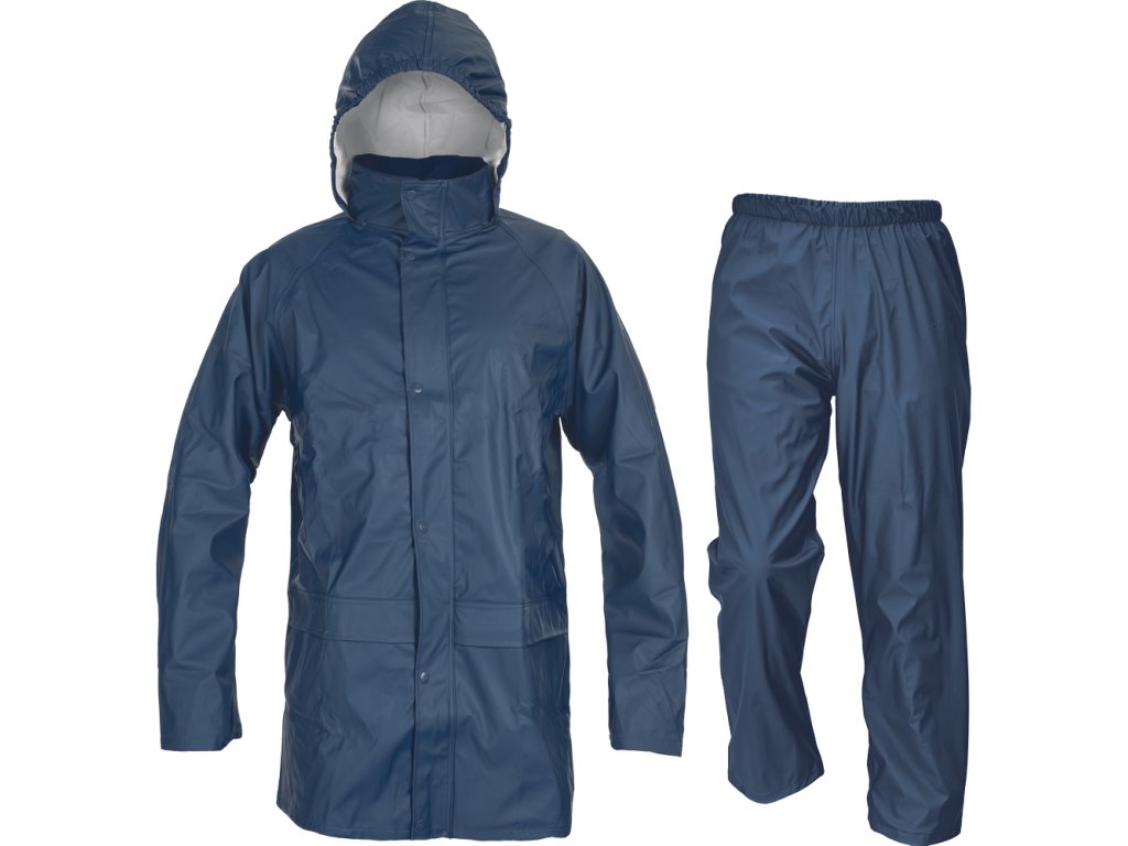 Nepromokavý a větru odolný komplet bundy a kalhot ¾ plášť s kapucí v límci kalhoty s gumou v pase dvě přední kapsy bundy kryté légami spodní lem rukávů lze upravit drukem.
